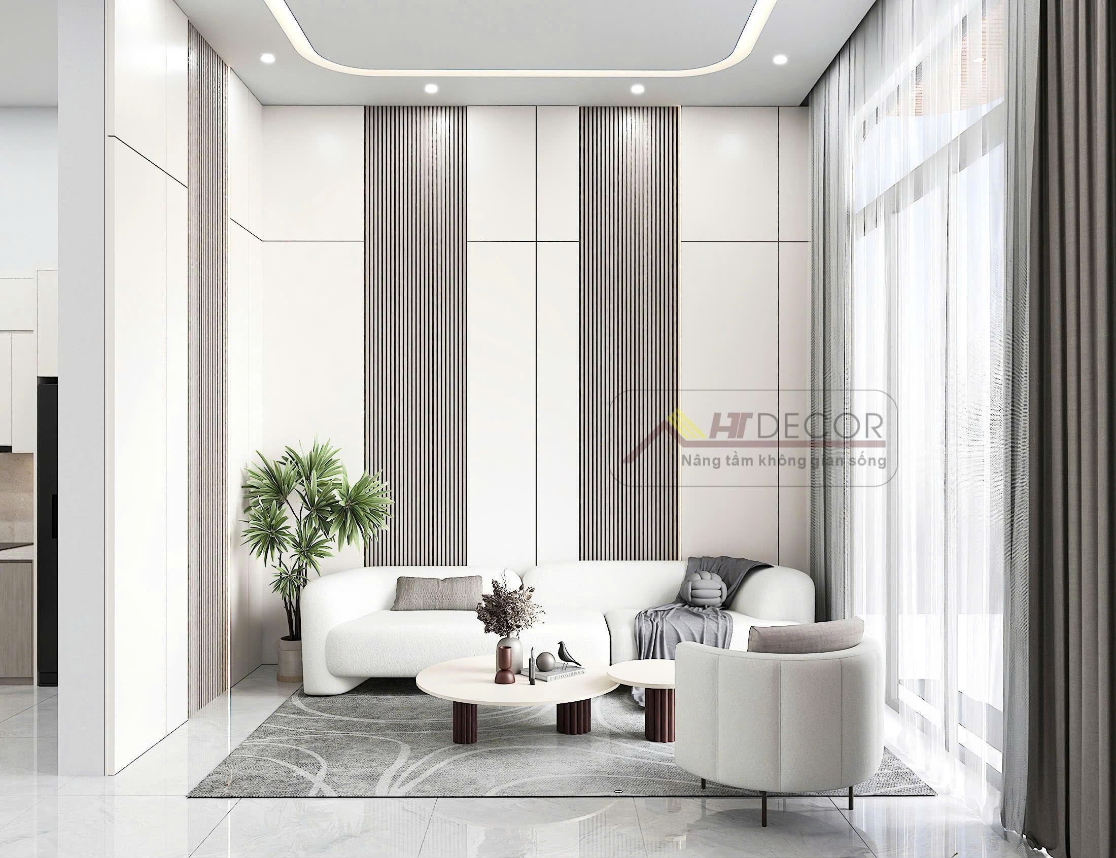 Phòng khách được thiết kế theo phong cách hiện đại, sử dụng bảng màu trắng – be kết hợp đường nét uốn cong mềm mại của sofa và bàn trà. Các mảng tường ốp lam dọc tạo hiệu ứng chiều cao, giúp không gian rộng rãi và sang trọng hơn. Ánh sáng tự nhiên từ cửa kính lớn cùng rèm voan mỏng, được tận dụng tối ưu, giúp căn phòng luôn sáng thoáng và tràn đầy sức sống.